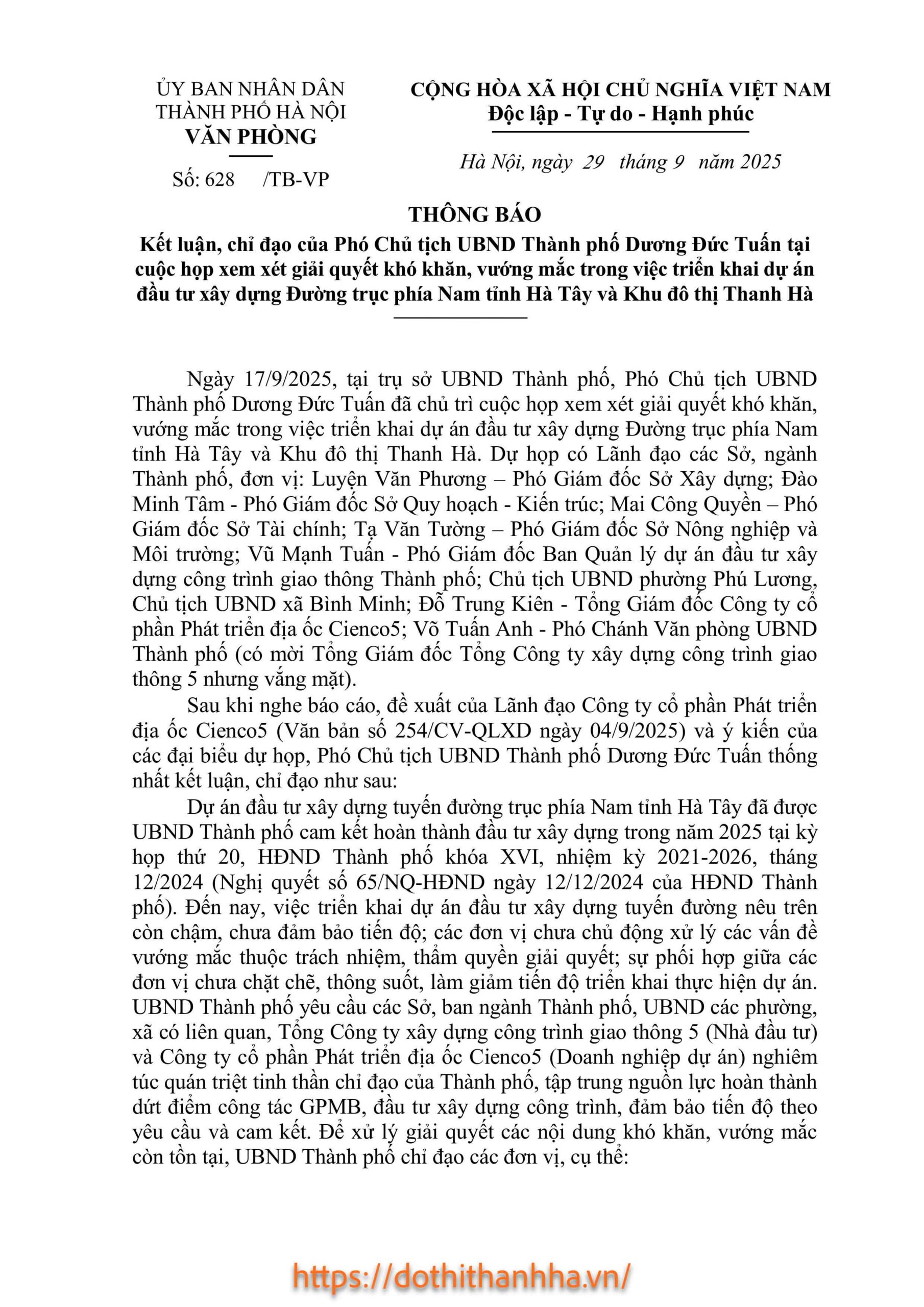 Ngày 17/9/2025, tại trụ sở UBND Thành phố, Phó Chủ tịch UBND Thành phố Dương Đức Tuấn đã chủ trì cuộc họp xem xét giải quyết khó khăn, vướng mắc trong việc triển khai dự án đầu tư xây dựng Đường trục phía Nam tỉnh Hà Tây và Khu đô thị Thanh Hà. Dự họp có Lãnh đạo các Sở, ngành Thành phố, đơn vị: Luyện Văn Phương – Phó Giám đốc Sở Xây dựng; Đào Minh Tâm – Phó Giám đốc Sở Quy hoạch – Kiến trúc; Mai Công Quyền – Phó Giám đốc Sở Tài chính; Tạ Văn Tường – Phó Giám đốc Sở Nông nghiệp và Môi trường; Vũ Mạnh Tuấn – Phó Giám đốc Ban Quản lý dự án đầu tư xây dựng công trình giao thông Thành phố; Chủ tịch UBND phường Phú Lương, Chủ tịch UBND xã Bình Minh; Đỗ Trung Kiên – Tổng Giám đốc Công ty cổ phần Phát triển địa ốc Cienco5; Võ Tuấn Anh – Phó Chánh Văn phòng UBND Thành phố (có mời Tổng Giám đốc Tổng Công ty xây dựng công trình giao thông 5 nhưng vắng mặt).