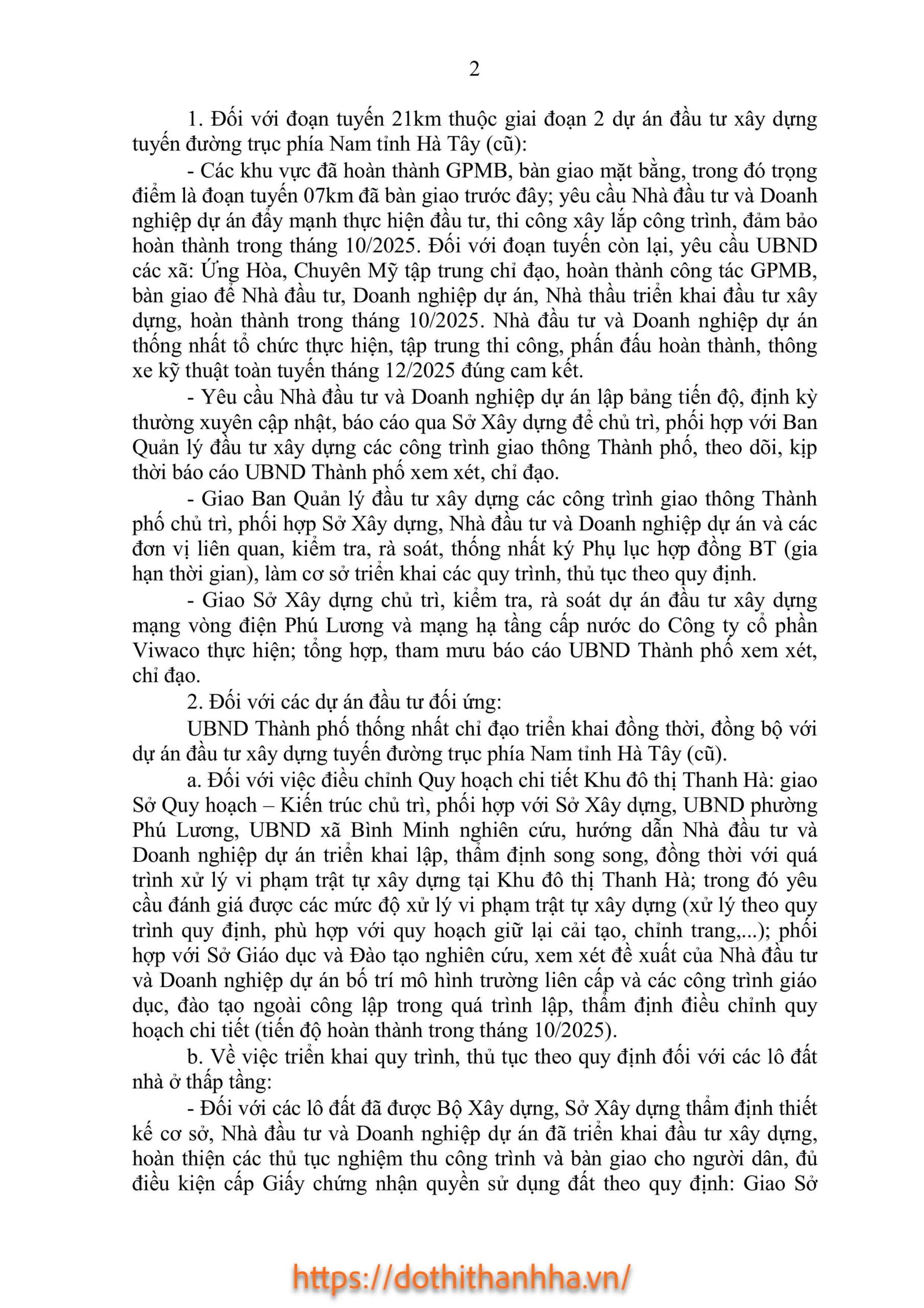 a. Đối với việc điều chỉnh Quy hoạch chi tiết Khu đô thị Thanh Hà: giao Sở Quy hoạch – Kiến trúc chủ trì, phối hợp với Sở Xây dựng, UBND phường Phú Lương, UBND xã Bình Minh nghiên cứu, hướng dẫn Nhà đầu tư và Doanh nghiệp dự án triển khai lập, thẩm định song song, đồng thời với quá trình xử lý vi phạm trật tự xây dựng tại Khu đô thị Thanh Hà; trong đó yêu cầu đánh giá được các mức độ xử lý vi phạm trật tự xây dựng (xử lý theo quy trình quy định, phù hợp với quy hoạch giữ lại cải tạo, chỉnh trang,…); phối hợp với Sở Giáo dục và Đào tạo nghiên cứu, xem xét đề xuất của Nhà đầu tư và Doanh nghiệp dự án bố trí mô hình trường liên cấp và các công trình giáo dục, đào tạo ngoài công lập trong quá trình lập, thẩm định điều chỉnh quy hoạch chi tiết (tiến độ hoàn thành trong tháng 10/2025).