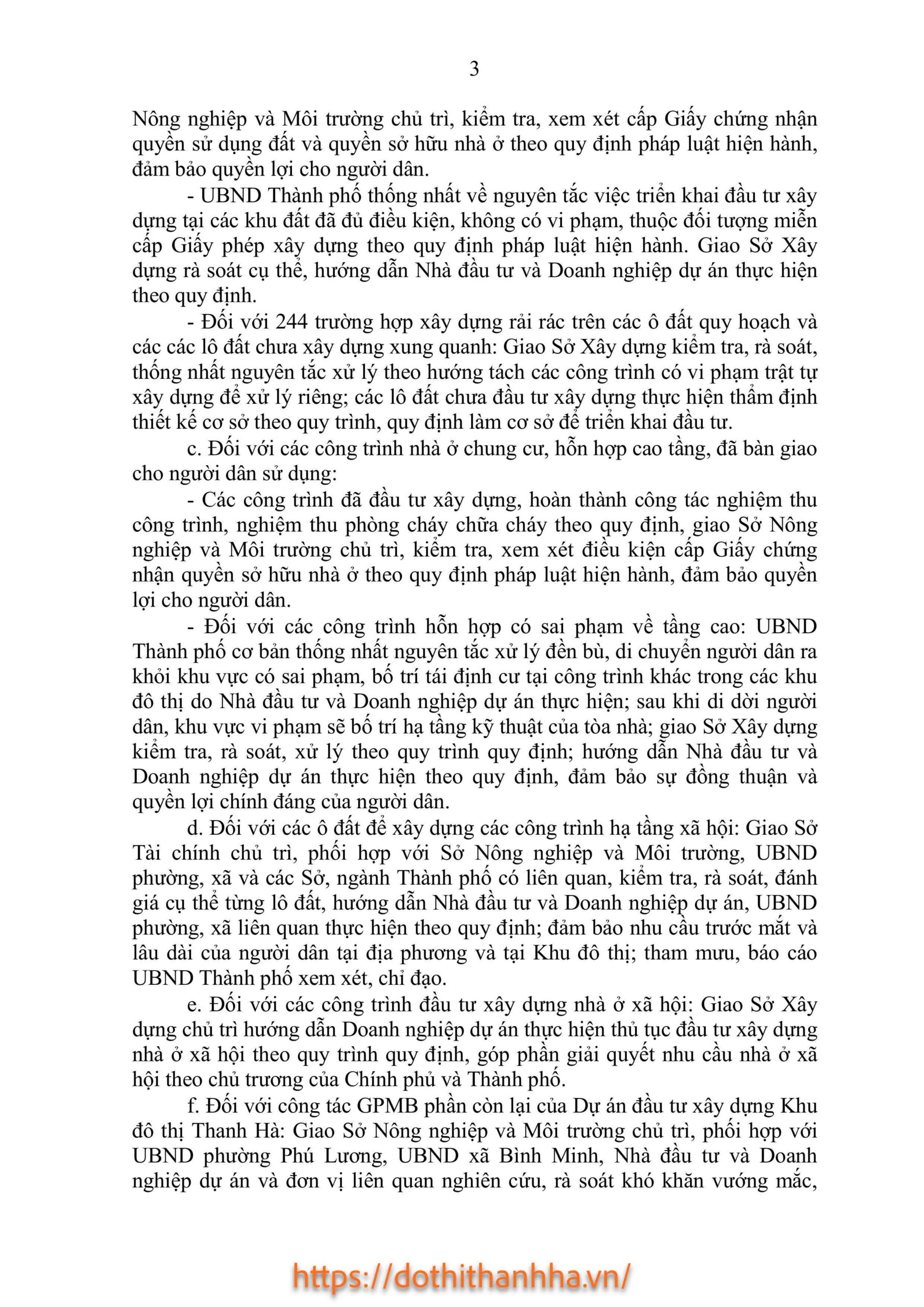 f. Đối với công tác GPMB phần còn lại của Dự án đầu tư xây dựng Khu đô thị Thanh Hà: Giao Sở Nông nghiệp và Môi trường chủ trì, phối hợp với UBND phường Phú Lương, UBND xã Bình Minh, Nhà đầu tư và Doanh nghiệp dự án và đơn vị liên quan nghiên cứu, rà soát khó khăn vướng mắc, khẩn trương đề xuất phương án tổng thể đẩy nhanh tiến độ triển khai GPMB tại dự án đầu tư và khu vực; tham mưu, báo cáo UBND Thành phố xem xét, chỉ đạo trong tháng 10/2025.
