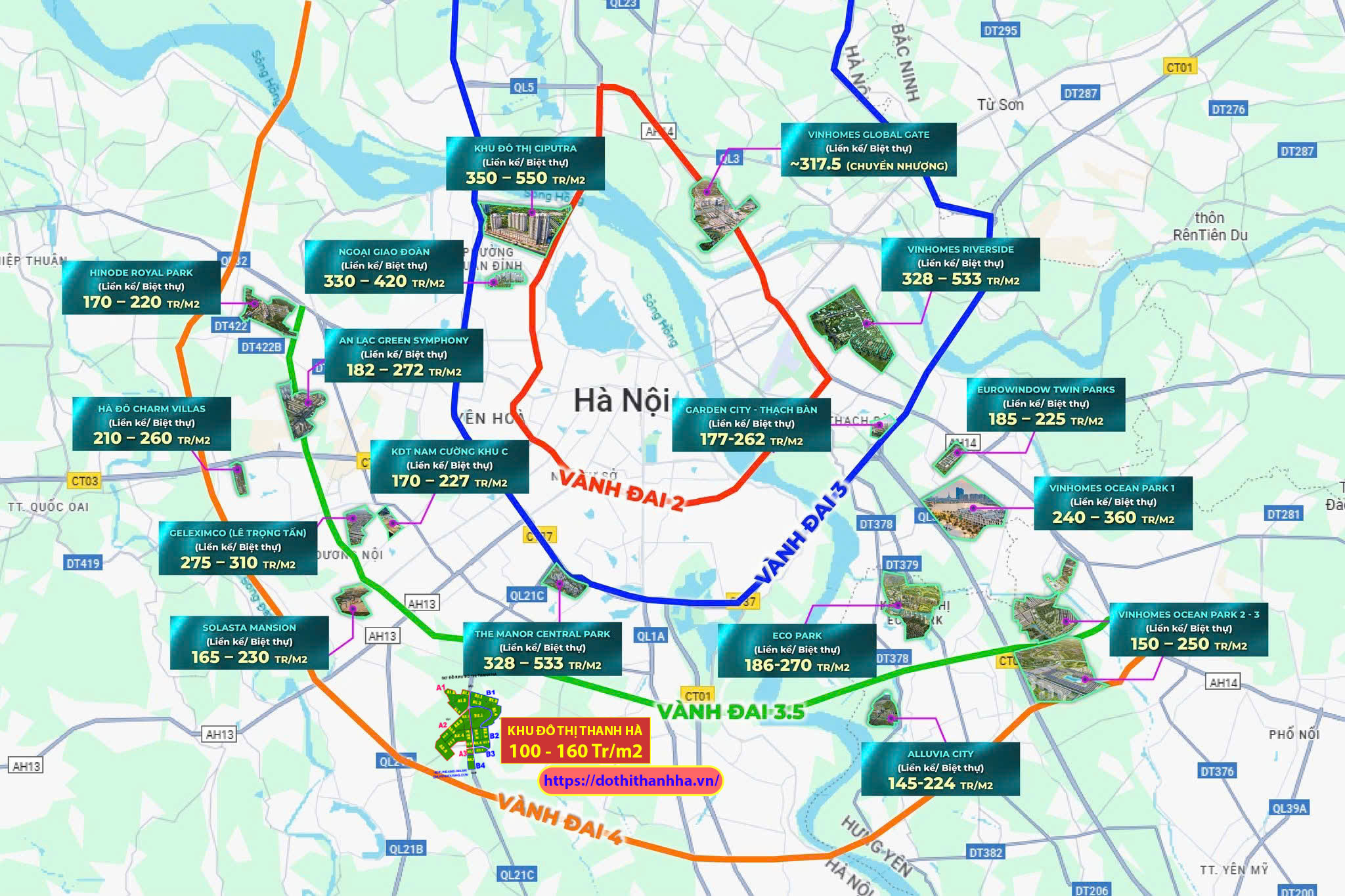 Dựa trên bản đồ giá năm 2025, giá đất các khu đô thị quanh Hà Nội đang dao động như sau: