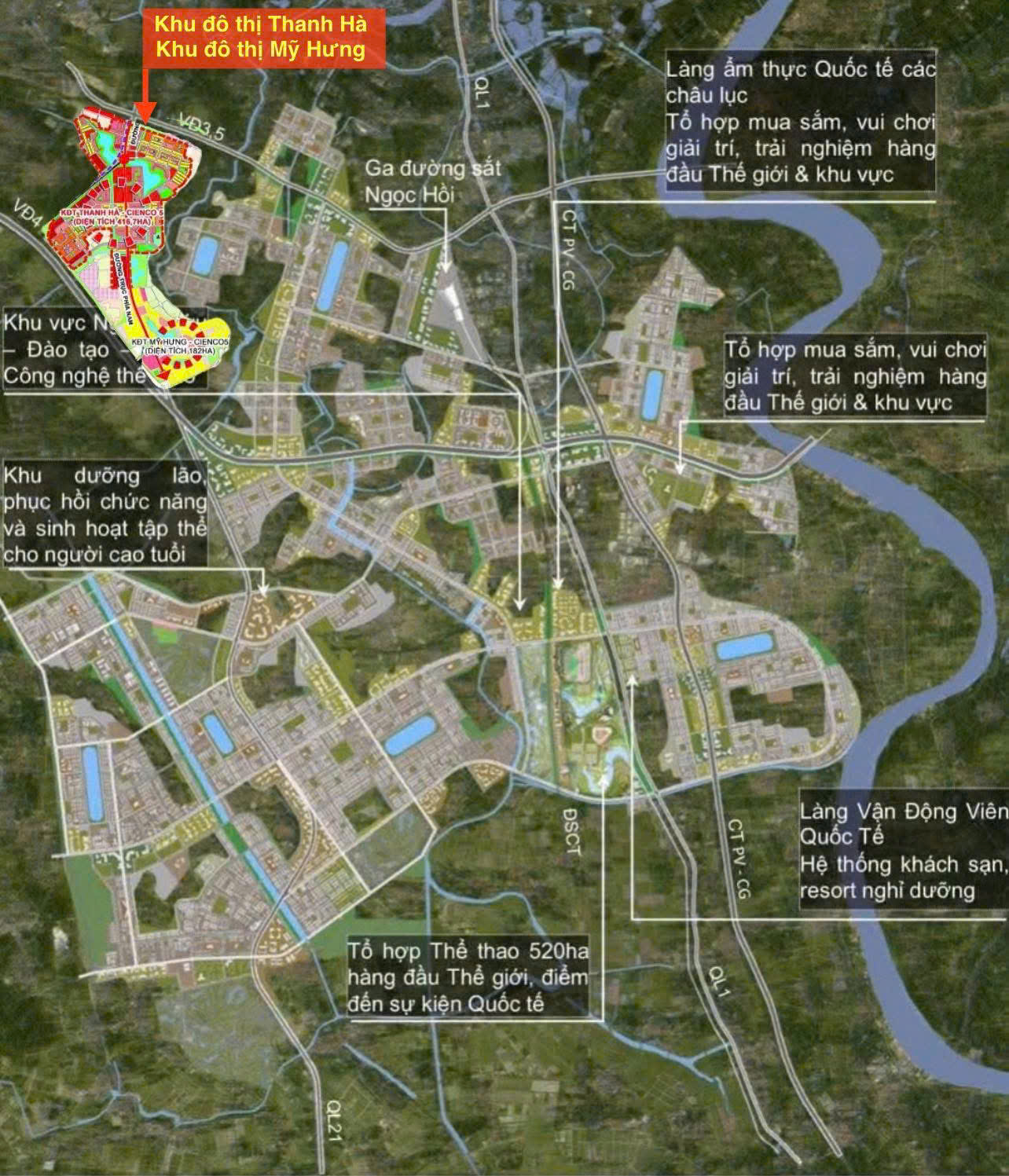 Đặc biệt, trong quy hoạch vùng thủ đô Hà Nội, khu vực phía Tây – Tây Nam (bao gồm Thanh Hà, Mỹ Hưng, Ngọc Hồi) sẽ trở thành trung tâm thể thao, văn hóa và dịch vụ quốc tế. Chính vì vậy, Thanh Hà được xem là khu đô thị đón đầu quy hoạch tầm nhìn 2030 – 2050, sở hữu vị trí “vàng” nhưng giá vẫn ở mức rất thấp so với mặt bằng chung.